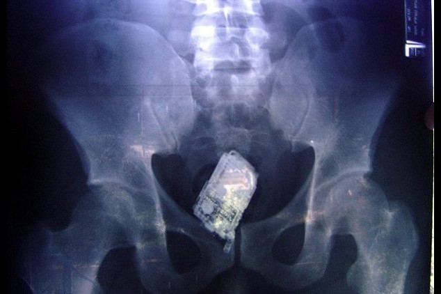 Sebuah benda asing ditemukan pada tubuh 4 orang tahanan dari penjara El Salvador, yaitu sebuah ponsel yang ditemukan di dalam usus. Foto sinar X dilakukan pada September 2006 karena kecurigaan petugas penjara . (Foto: Centros Penales)