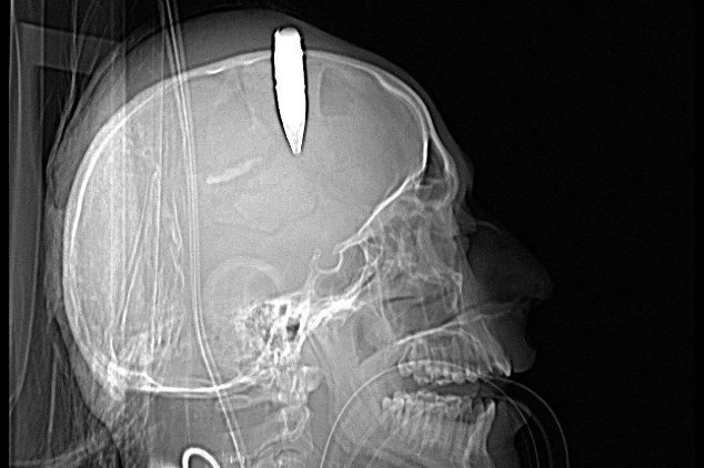 Foto CT Scan dibawah ini lebih mengerikan karena terdapat sebuah logam yang menembus tengkorak kepala. Foto tersebut dirilis pada 16 Agustus 2012 oleh Miguel Couto Hospital. Peristiwa yang dialami oleh Eduardo Leite ( 24 tahun ) seorang pekerja konstruksi yang tertusuk oleh batang logam di Rio de Janeiro - Brasil. Dokter menyatakan bahwa Leite selamat dari kejadian yang menimpa dirinya setelah tertembus logam sepanjang 182 Cm yang menusuk kepalanya.(Foto: Huffingtonpost)